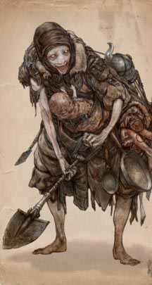 Дурная порода. Карги любят украшать себя чем-то мёртвым, подчеркивая внешность костьми, кусками плоти и грязью. Они специально теребят раны и не сводят пятна с кожи, превращая их в гноящуюся плоть. Красивые существа вызывают у карг отвращение, но они могут им «помочь», изменив их тело.