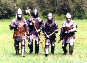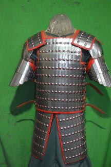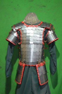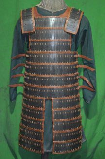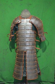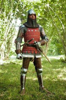 Наборный доспех. Этот доспех состоит из узких вертикальных металлических пластин, приклёпанных к кожаной подложке, носимой поверх слоя ватина. Соединения защищаются кольчужным полотном.