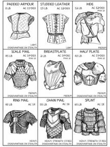 Шкурный. Этот грубый доспех состоит из толстых мехов и шкур. Обычно их носят племена варваров, злые гуманоиды и прочие народы, у которых нет инструментов и материалов для создания более качественных доспехов.