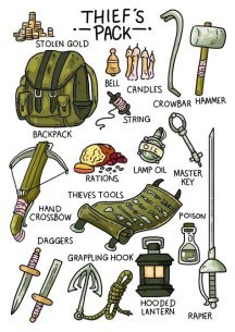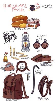 Набор взломщика (16 зм). Включает рюкзак, сумку с 1 000 металлических шариков, 10 футов лески, колокольчик, 5 свечек, ломик, молоток, 10 шлямбуров, закрытый фонарь, 2 фляги масла, рационы на 5 дней, трутницу и бурдюк. В набор также входит 50-футовая пеньковая верёвка, закреплённая сбоку.