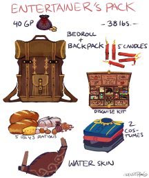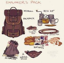 Набор путешественника (10 зм). Включает рюкзак, спальник, столовый набор, трутницу, 10 факелов, рационы на 10 дней и бурдюк. В набор также входит 50-футовая пеньковая верёвка, закреплённая сбоку.