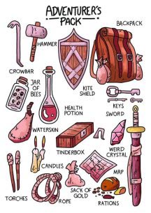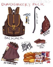 Набор исследователя подземелий (12 зм). Включает рюкзак, ломик, молоток, 10 шлямбуров, 10 факелов, трутницу, рационы на 10 дней и бурдюк. В набор также входит 50-футовая пеньковая верёвка, закреплённая сбоку.