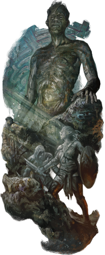 Касание окаменения (перезарядка 5-6). Великан касается одного существа, находящегося в пределах 10 футов. Цель должна совершить спасбросок Телосложения Сл 17, иначе получит 26 (4к12) урона силовым полем и начинает превращаться в камень и становится опутанным. Опутанное существо должно повторить спасбросок в конце своего следующего хода, становясь окаменевшим при провале или оканчивая эффект при успехе.