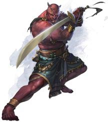 Скимитар. Рукопашная атака оружием: +10 к попаданию, досягаемость 5 футов, одна цель. Попадание: Рубящий урон 13 (2к6 + 6) плюс урон огнём 7 (2к6).