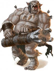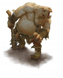 Огры слабы умом, но зато сильны телом. Они живут, грабя, собирая отбросы и убивая ради пропитания и удовольствия. Средняя взрослая особь бывает ростом от 9 до 10 футов и весом около тысячи фунтов.
