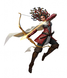 Мультиатака. Медуза совершает либо три рукопашные атаки — одну змеиными волосами и две коротким мечом — либо две дальнобойные атаки длинным луком.