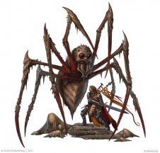 Паутина (перезарядка 5–6). Дальнобойная атака оружием: +5 к попаданию, дистанция 30 футов/60 футов, одно существо. Попадание: Цель становится опутанной паутиной. Опутанная цель может действием совершить проверку Силы Сл 12, разрывая паутину при успехе. Паутину можно атаковать и уничтожить (КД 10; хиты 5; уязвимость к урону огнём; иммунитет к дробящему урону, урону ядом и урону психической энергией).