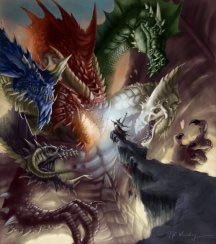 Пятиглавая прародительница цветных драконов, Тиамат воплощает пороки злых драконов. После разрушения Первого Мира она жила в Девяти Преисподних — некоторые говорят, что по собственному желанию. Но другие утверждают, что она заключена там в тюрьму, чтобы наказать ее за зло, которое она совершила, когда боги пытались колонизировать Первый Мир со своими последователями.