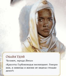 Её цель — привезти магические сокровища для её нанимателя, принца-купца Порта Нянзару — Ваканги О’таму. Она отговаривает низкоуровненных искателей приключений от исследования Подгорья, но с радостью поможет своей магией, когда они заработают достаточно опыта, чтобы быть полезными. Если вы планируешь провести Глубоководье: Подземелье Безумного Мага после этого приключения, Обайя может взять на себя более интересную роль, чем простой советчик и источник заданий.