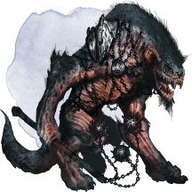 Зверь Мясник [Yeenoghu, the Beast of Butchery and the Gnoll Lord] представляет собой огромного покрытого боевыми шрамами гнолла высотой в 14 футов.