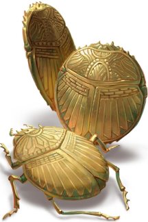Сокровищный скарабей - это существа, похожие на жуков, которые благодаря какой-то естественной адаптации или алхимической изобретательности идеально вписываются в груды золотых монет. Они питаются крошечными клещами, которые заражают чешую и логово дракона, и их болезненный укус может быть сильным сдерживающим фактором для потенциальных похитителей сокровищ.