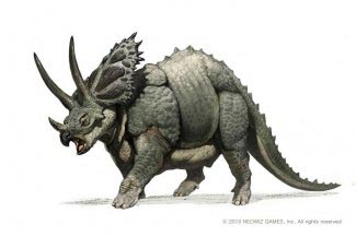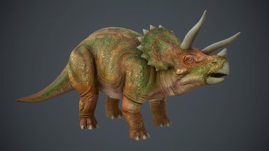 Один из самых агрессивных травоядных динозавров. Череп трицератопса имеет костяной воротник, служащий для защиты. С внушительными рогами и впечатляющей скоростью трицератопс может без проблем нанизать хищника на рога или растоптать.