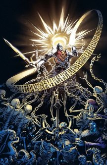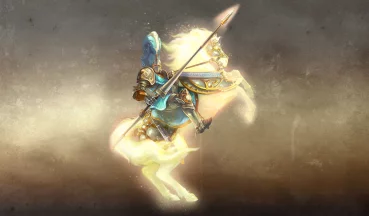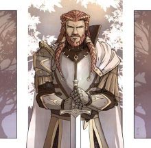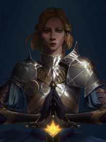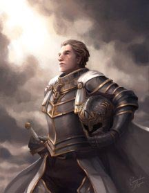 Закованный в латы, сверкающие на солнце, несмотря на пыль и грязь долгого путешествия, человек складывает свой меч и щит и касается ладонями смертельно раненного мужчины. Божественное сияние исходит из его рук, и раны мужчины затягиваются, а глаза широко раскрываются в изумлении.