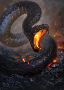- Из «Эпоса огня», многовековой поэмыПепельные змеи - огромные чудовища, напоминающие змей, вылепленных из вулканической магмы. Их тела пылают внутренним жаром под угольно-серыми чешуйками, покрывающими их фигуры. Несмотря на то что пылающий свет, исходящий из их пустых глазниц, создает впечатление, будто пепельные змеи могут видеть, они полностью полагаются на ощущение вибрации для оценки окружающей обстановки.