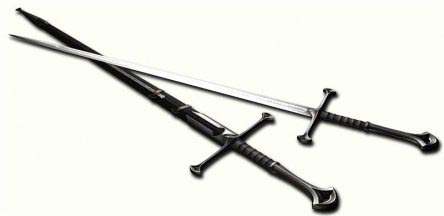 Длинный двуручный меч, его очень трудно держать без достаточной силы. Он загорается синим пламенем если человек носящий его достоин или достаточно силён.