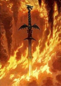 Меч излучает пульсирующее свечение. Странная рукоять в форме орла. Этот меч был выкован безумным знатоком магии и кузнечного дела на нижних планах существования для Маммона, эрцгерцога 3 слоя Баатора (Ада). Он часто использовался в время кровавой войны, после чего был утерян. Я знаю сколько страданий он принес в этот мир, поэтому умоляю уничтожьте его пока он вас не развратил.