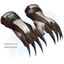 Эта пара перчаток без пальцев украшена полосами, похожими на барсучьи, и снабжена острыми как бритва когтями. Во время ношения перчаток ваши безоружные удары с их помощью наносят дробящий урон, равный 1к4 + ваш модификатор Силы, вместо обычного урона от удара дубинкой для безоружного удара. Кроме того, вы получаете скорость копания в 5 футов.