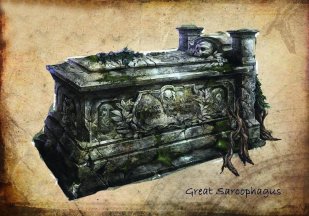 Этот древний саркофаг обладает невероятной силой регенерации. Если вы проведете в нем короткий отдых, то восстановите все хит поинты, а также вылечите одно незначительное заболевание. Если провести в нем 8 часов, то мертвое тело может быть возвращено к жизни, а калеки могут быть отращены конечности и замедлено старение. Если вы проведете в саркофаге время, не имея никаких ранений, то ваше мировоззрение начнет меняться в сторону зла, так как саркофаг будет высасывать вашу человечность.