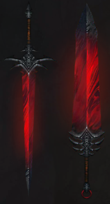 Этот меч, созданный из свернувшейся крови, темно-красного, почти черного цвета. Он теплый на ощупь и испускать энергетические импульсы. Согласно легенде, клинок обладает собственной волей и становится сильнее, впитывая кровь своих жертв. Меч может даже сделать своего владельца бессмертным, но цена крайне высока.