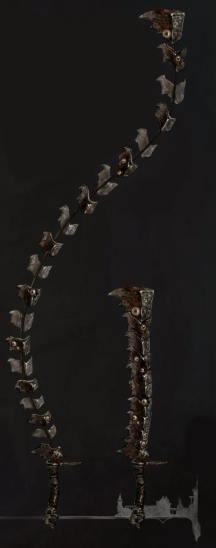 Хитрое оружие. Бонусным действием вы можете переключаться между трансформированным и нетрансформированным состояниями этого оружия. В своем нетрансформированном состоянии это оружие представляет собой тесак, усеянный глазными яблоками. В своём трансформированном состоянии оружие представляет собой кнут, состоящий из металлических кусков, скрепленных сухожилиями из крови и плоти.