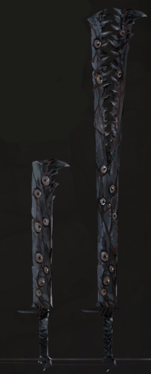 Хитрое оружие. Бонусным действием вы можете переключаться между трансформированным и нетрансформированным состояниями этого оружия. В своем нетрансформированном состоянии это оружие представляет собой тесак, усеянный глазными яблоками. В своём трансформированном состоянии оружие представляет собой кнут, состоящий из металлических кусков, скрепленных сухожилиями из крови и плоти.
