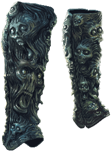 Каждый из этих черных поножей украшен изображениями чудовищных черепов, вопящих от ужаса.