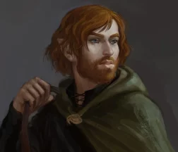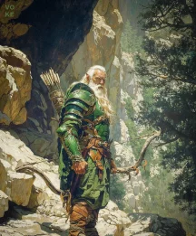 Флинт щурился, вглядываясь против света, он увидел человека, шедшего к нему по склону. Поднявшись, Флинт отступил в тень высокой сосны, чтобы свет не так бил в глаза. Походка человека была упругой и лёгкой — на эльфийский лад, подумалось Флинту, — но тело выглядело мускулистым и крепким, — черта не вполне эльфийская. Зелёный капюшон мешал разглядеть лицо. Флинт видел только загорелые щёки и рыжевато-русую бороду, какие у эльфов не растут никогда. При бедре у человека висел меч, а на плече — длинный лук. На нём была одежда из мягкой кожи с тиснёным узором. Узор был эльфийским. Но борода? Погодите-ка...